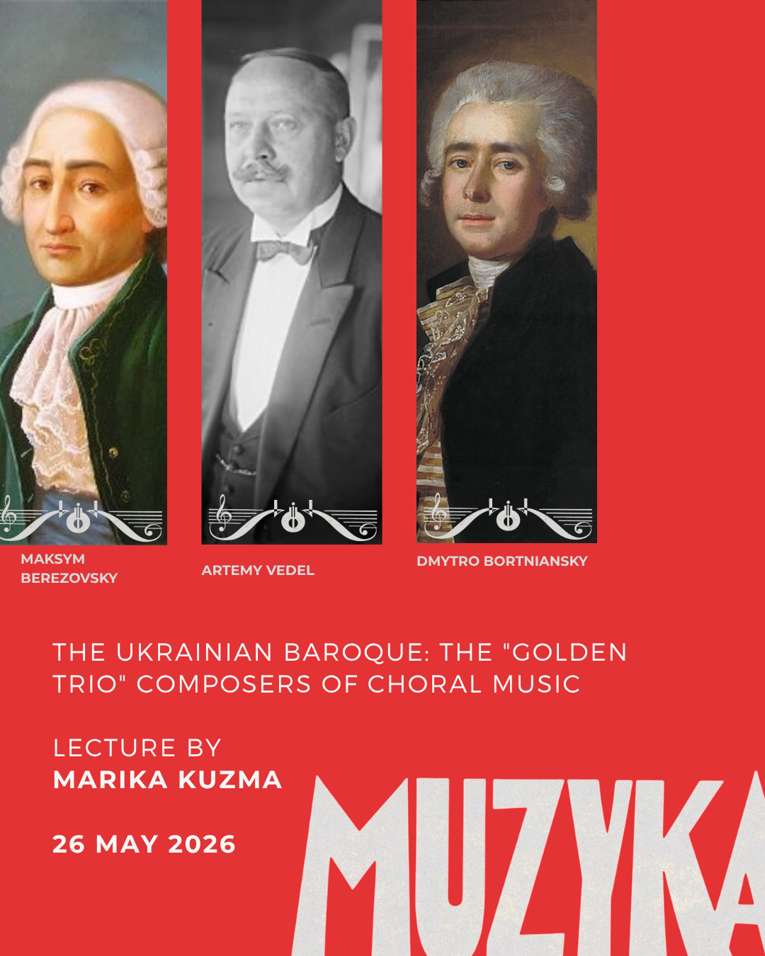 Join the fourth seminar of our Muzyka 2026 programme on Ukrainian music. We will discover the "Golden Trio" — Vedel, Berezovsky, and Bortniansky — whose virtuosic a cappella choral music at the turn of the nineteenth century shaped the course of both Ukrainian and Russian composition.